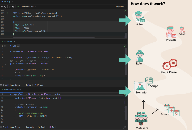 Below a picture of how the model is implemented by using our Backlot framework, based on C#. The example does show a solution saying “hi” to a an external saved actor (person), in this case “Kees”.